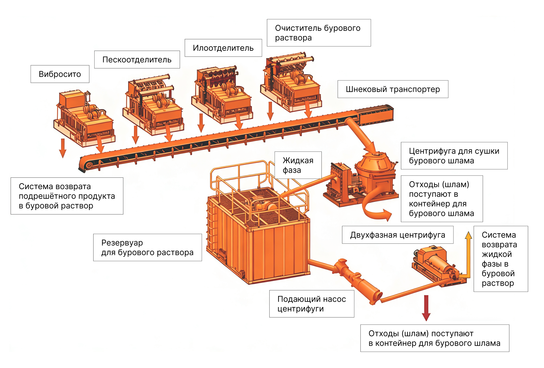 Система безамбарной обработки бурового шлама предназначена для снижения объёма отходов бурения за счёт применения технологий центробежного разделения. Она позволяет обрабатывать водоосновные и нефтяные буровые шламы, а также буровой раствор после бурения. В состав системы входят вибросито, очиститель бурового раствора, шнековый транспортер, центрифуга для сушки бурового шлама, буровые резервуары, песковый или винтовой насос, а также центрифуга.